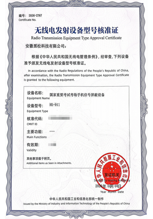 全国首批通过国家重要考试考场手机信号屏蔽设备型号核准,各项指标均符合国家监管标准,资质齐全,使用安心。