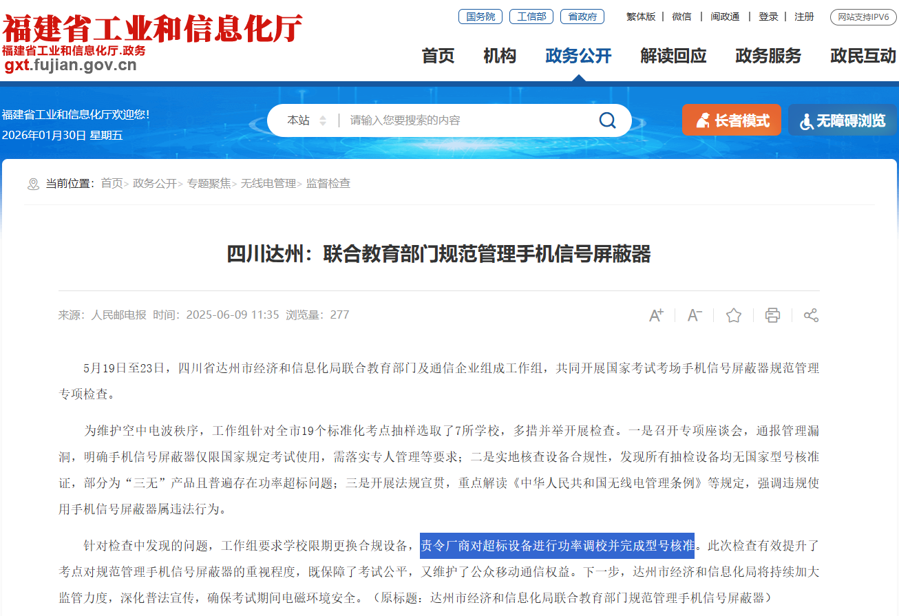 针对检查中发现的问题,工作组要求学校限期更换合规设备,责令厂商对超标设备进行功率调校并完成型号核准。此次检查有效提升了考点对规范管理手机信号屏蔽器的重视程度,既保障了考试公平,又维护了公众移动通信权益。下一步,达州市经济和信息化局将持续加大监管力度,深化普法宣传,确保考试期间电磁环境安全。